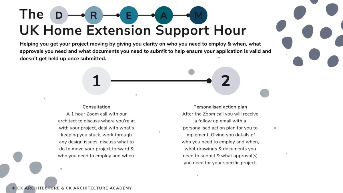 That is why I have created the D.R.E.A.M UK Home Extension Support Hour - so you can get support with your project, including what you need to do & who you need to hire and when, what approvals you need, what documents you need to submit for your specific project - there are many things which might be required but every project is different.